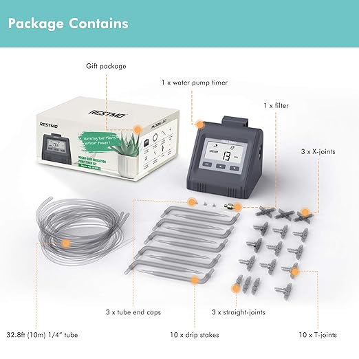 - PACKAGE LIST: Packed with a compact and elegant gift box, which includes Water Pump Timer x 1, 1/4” Tube x 32.8ft, Filter x 1, X-Joints x 3, T-Joints x 10, Straight-Joints x 3, Drip Stakes x 10 and Tube End Caps x 3