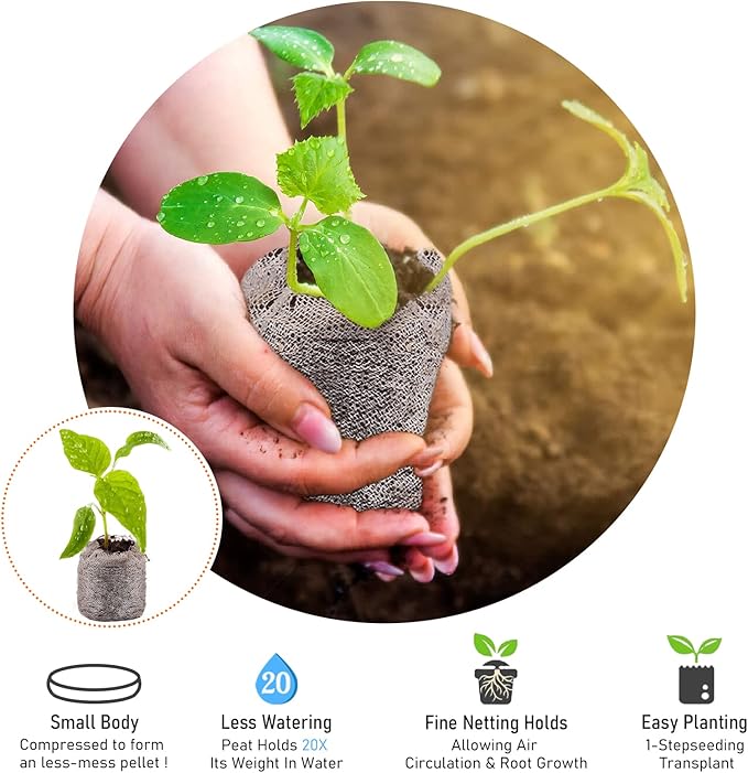 - Premium Material: Peat pellets are made of peat, which has great aeration and water retention, so it is beneficial for plants to help plant growth, and can be completely degraded; They are small and compact, easily and cleanly storable, easy to transition into bigger containers