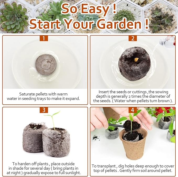 - Premium Material: Peat pellets are made of peat, which has great aeration and water retention, so it is beneficial for plants to help plant growth, and can be completely degraded; They are small and compact, easily and cleanly storable, easy to transition into bigger containers