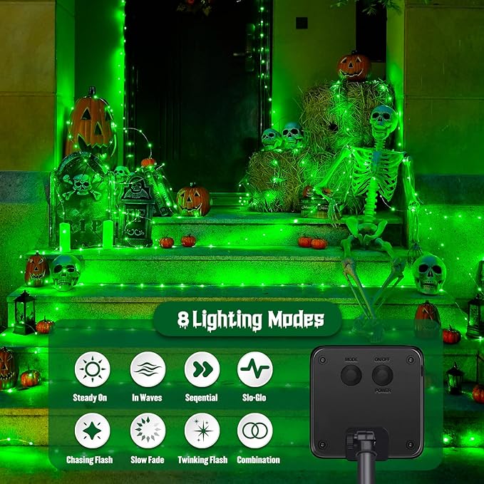 - Green Halloween Lights Outdoor Waterproof: Both the copper wire and the solar panel are IP44 Waterproof, it withstands all kinds of weather, including heavy rain and snow. Solar Christmas lights are suitable for both indoor and outdoor usage without any worry of short circuits or weather damage