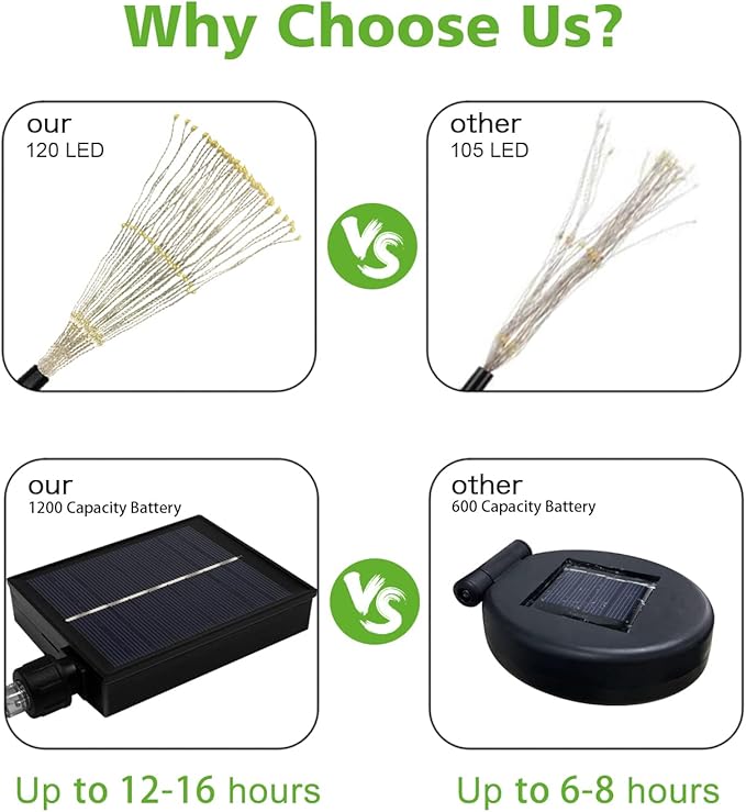 - [Continuous Lighting For 12~16h] While most brands use 600 capacity battery, Unihoh solar garden fireworks lights are equipped with 1200 ultra-large capacity rechargeable battery, which is able to provide 12-16 hours of continuous lighting after 4-6 hours of full charge while others can only work 6-8 hours.