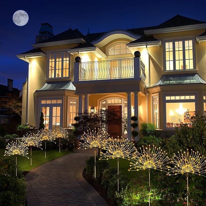 - [Upgraded Creative Waterproof Garden Lamp] Each solar yard light adopts 30 flexible high-quality copper wire and 120 led beads, which can be easily bent into any shape you like, such as fireworks, flowers, ferries wheel, and heart shapes. These outdoor ornaments have colorful lights, they illuminate the flower bed, pathways, lawn, driveway, camping grounds, Christmas parties to create a festive and romantic atmosphere.