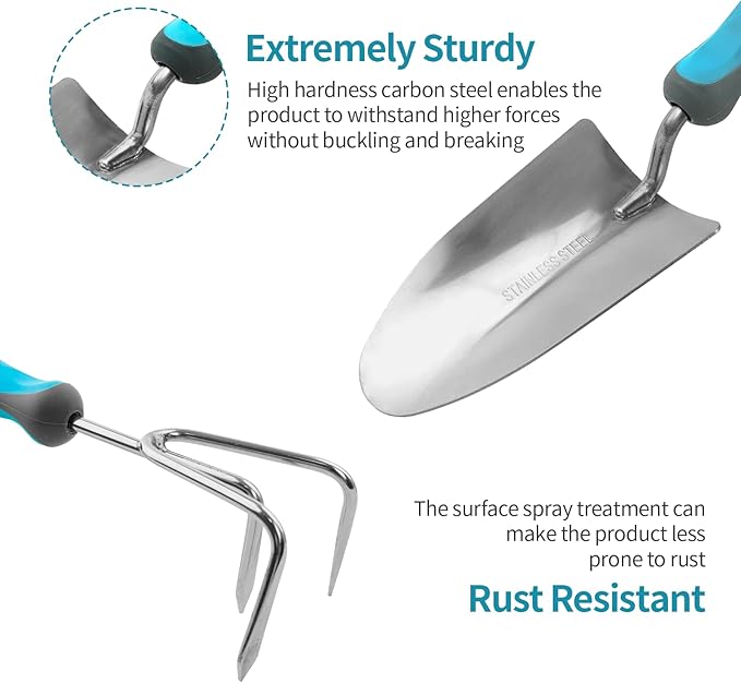 - The garden tool set includes 3 pieces useful hand tools: trowel, transplanter, hand rake. The set tool are strong and durable, with high hardness and no need to worry about rusting and breaking.