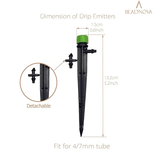 - PACKAGE INCLUDES: 50pcs drip emitter in length around 5.2 inches / 13cm. Each drip emitter has 8 outlet holes at the top which diameter is adjustable between 0.05 inch to 1.4mm approximately. Irrigation sprayer suitable for 4/7mm (inner/outer diameter) hose, or 1/4 inch tube. Color green.