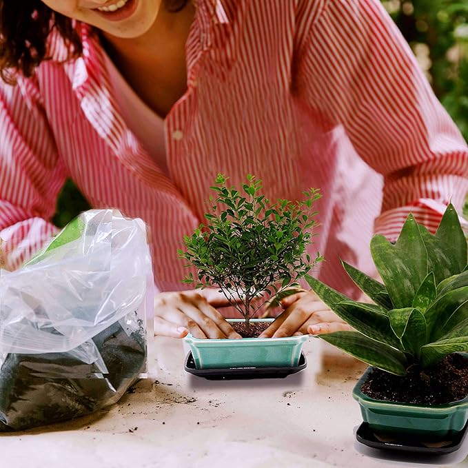 - Compact Design: Our focus is to provide beginners with a bonsai training pot suitable for planting miniature bonsai and cacti. The size of each indoor tree pot is 6.15×4.75×1.5 inches. Each tree pot is equipped with a black tray, drain hole and drain hole filter. You no longer need to worry about water flowing onto the desktop.