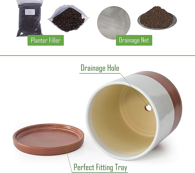 - Drainage holes and detachable/perfectly fitting ceramic saucers included.
