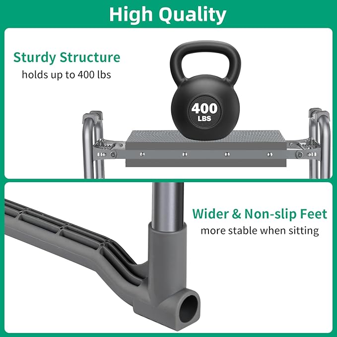 - 【WIDER KNEELING PAD & STABLE】 This Upgraded garden kneeler and seat is built with large soft kneeling pad: 10.24 inch wide soft EVA foam pad is more comfortable when sitting or kneeling. Besides, wide metal frame is more stable during use, no worries about tipping over.