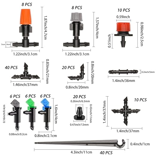 - Large quantities: 190 matching kits total, Spray (8 pcs), Micro Drip (10pcs), Tees (40pcs), Drip Emitter (18pcs), Oblique Barbed 4-way Connector (10pcs), Support Stakes (40pcs), Barbed Hose End Plug (20pcs), Hose Elbows Fittings (20pcs), Single barbs (20pcs)