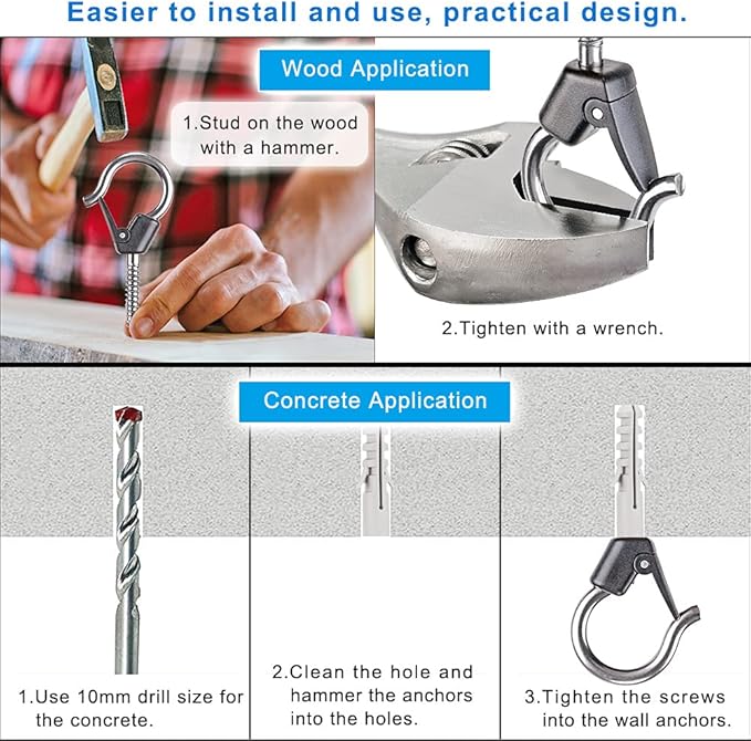 - 【Easy Installation】Wall Mount Ceiling Hooks are quick and easy to install.You can tap directly into the wood with a hammer or screw into the wood with a wrench. Contains four Enter the wall to expand the colloidal particles, which can be installed on concrete ceilings or walls.