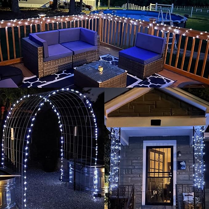 - Brilliant Outdoor Decor: 100 LED starry-style fairy lights with white light accent your space with a unique, inviting glow. 33ft length is perfect to put around a garden or porch railing.They were the finishing touch for a back yard bbq, party, wreath, fence, patio, pools, bush, holiday, indoor, outdoor. In the dark, the wire fades to invisible, leaving only the fairy lights, create a classy and romantic atmosphere.