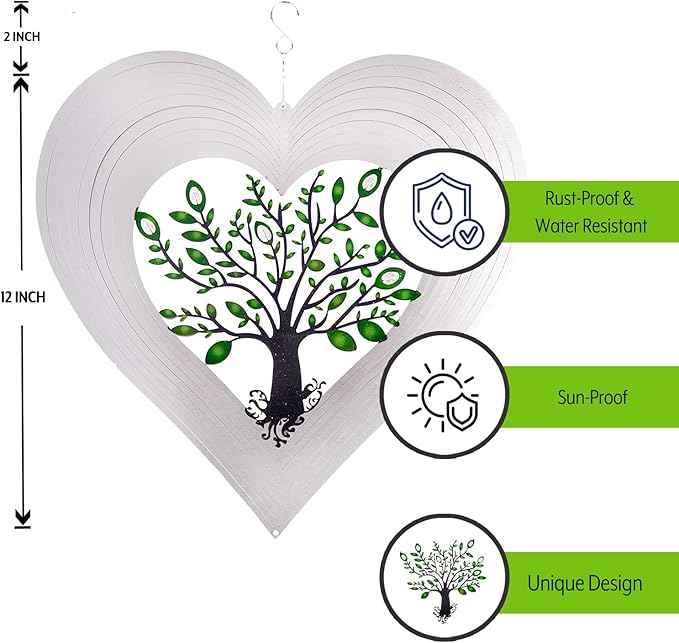 - UNIQUE DESIGN - Our Hearted Tree of life wind spinner has an elegant, stylish, and unique design to make your garden stand out. They create an incredible 3D illusion when the wind blows against them to create a magical sight that will keep you glued outdoors in your garden or porch.
