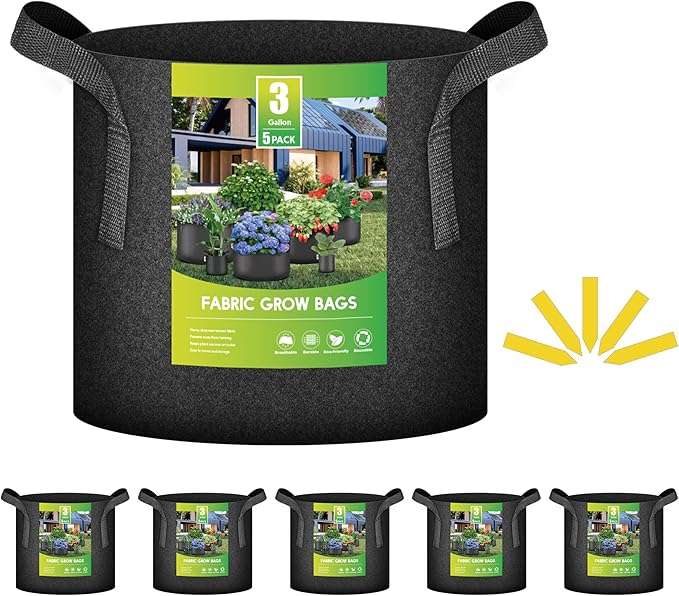iPower 5-Pack 3 Gallon Plant Grow Bags Thickened Nonwoven Aeration Fabric Pots Heavy Duty Durable Container, Strap Handles for Garden, Black
