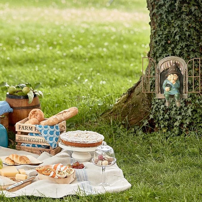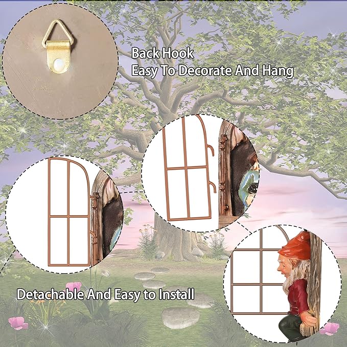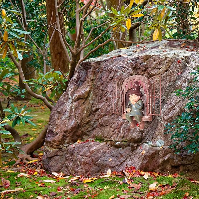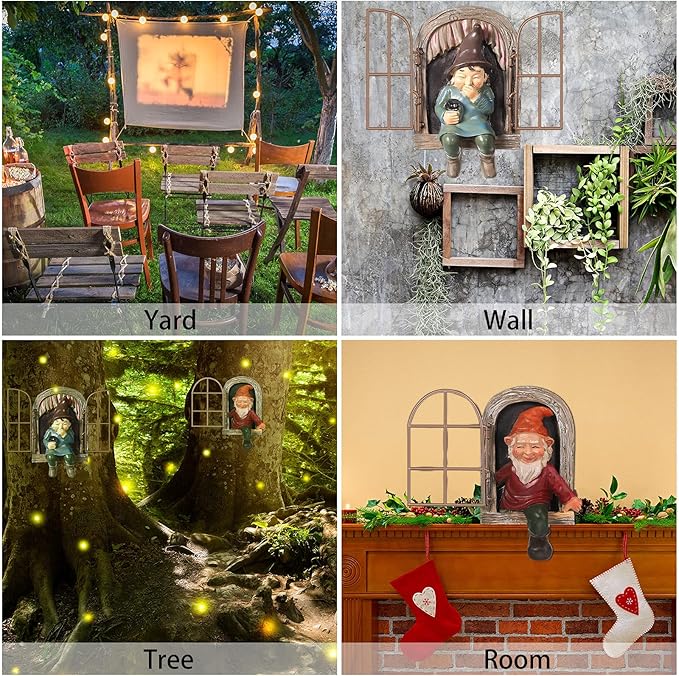 - Add interest: you can hang these cute little elfs on your tree or fence that appear to be climbing out of a wooden window, plus a swinging metal windowpane which enhances a sense of reality to the sculpture furthermore