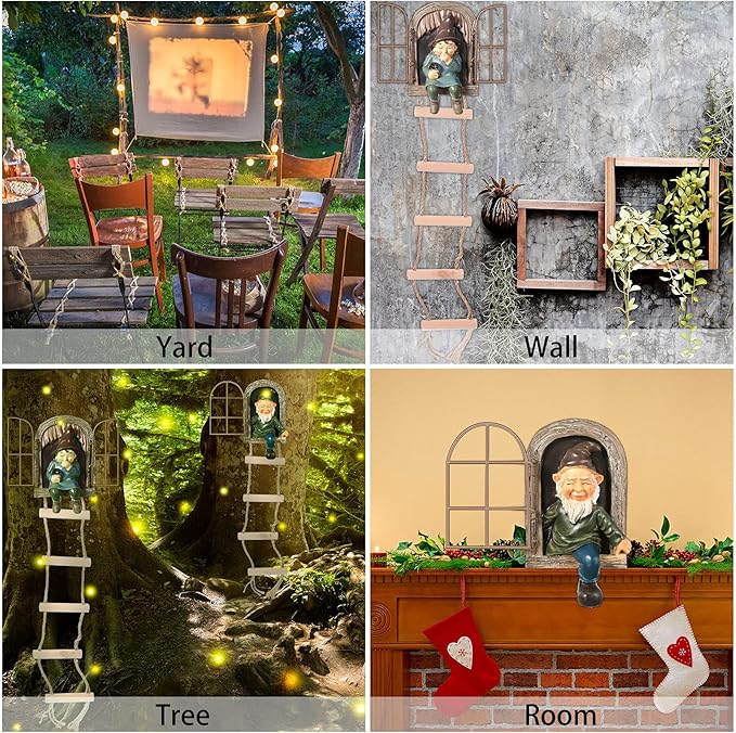 - Add interesting to your garden: you can hang these cute garden statue gnomes on your tree or fence that appear to be climbing out of a wooden window then down the ladder, plus a swinging metal windowpane which enhances a sense of reality to the sculpture furthermore; This combination is a nice way to add personality to any tree or to add interest to ordinary fences