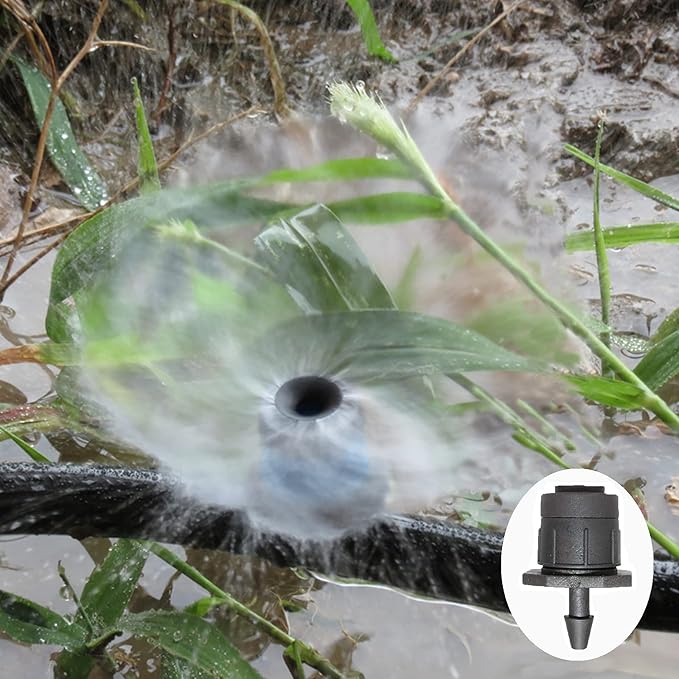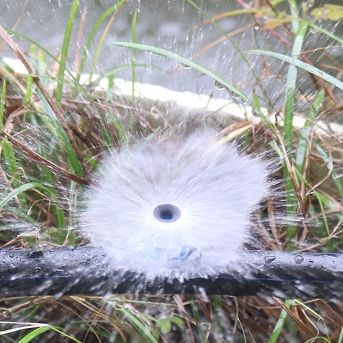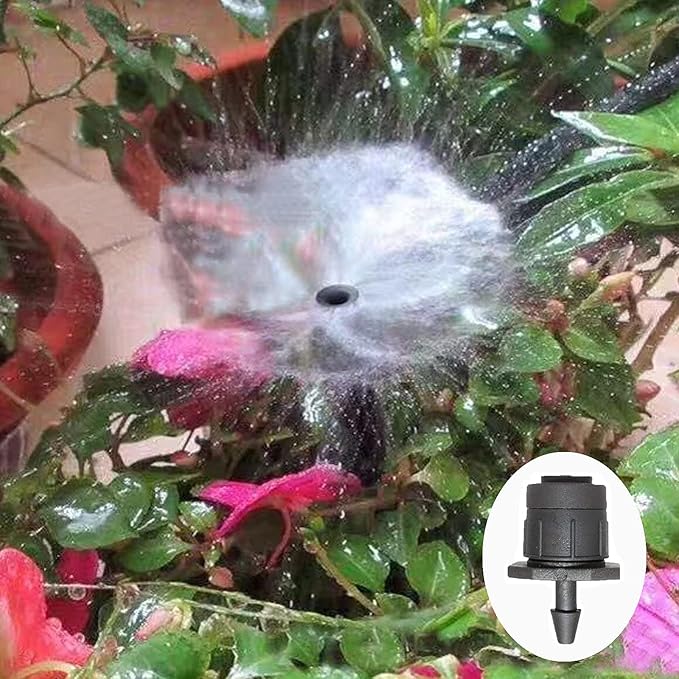 - Adjustable: 360 degree micro sprayer, turning the cap on top to easily adjust water flow from 0 to 23 us gal per hour(0-90L), and the radius of sprinkling circle about 7.87in(20cm), working pressure: 1KG-3KG