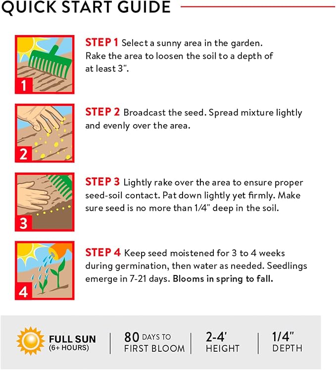 - Bullet Point 3: 25,000 NON-GMO SEEDS: Easy-to-sow flower seeds mix covers up to 1,000 square feet and is ideal for most soil types. Select a sunny area to scatter the seed outdoors for planting after danger of heavy frost. Flowers grow 2-4’ tall, blooming in spring, summer and fall.