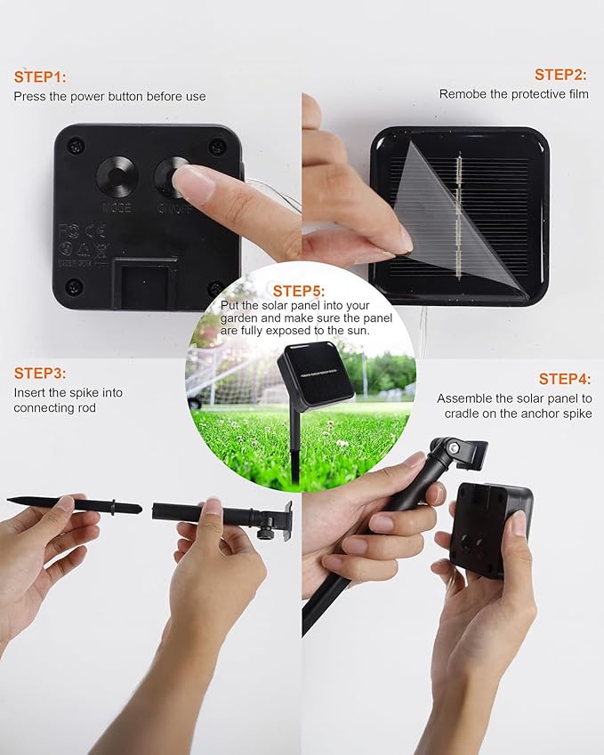- Solar Powered Lights: Powered by solar, charged in full and direct sunlight for 8-12 hours and suffices for 10 to 14 hours (charging and working time will change depending on the weather), the lights automatically turn the light on at dusk and off at dawn. Each light includes NI-MH AA 800mAh rechargeable battery, the battery has sufficient capacity for bright all night. NOTE: There is a ON/OFF switch button at the back of solar panel, please switch it ON before charging.
