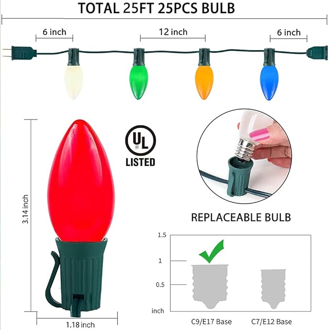 - Easy To Install: Set up your outdoor Christmas string lights in minutes. Extra one bulbs come in the box for replacement so you can remove the burnt out bulb and then install it. Your 100% Satisfaction is what drives us to be the best! If you are not fully satisfied for any reason, please contact us. For C9 bulbs, please search ASIN: B0995C3MX5