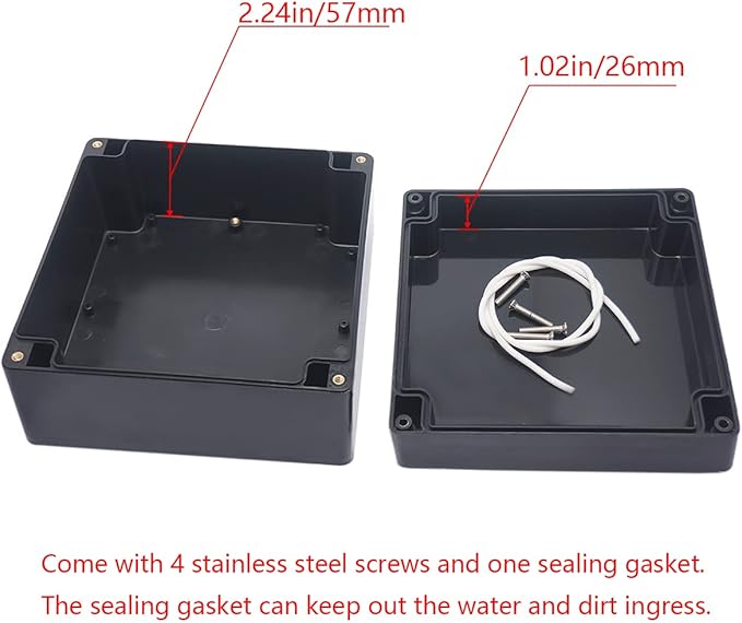 - 【Size】- Outer size of the project box: 6.3"x 6.3"x3.54"(160 x 160 x90 mm); Inner size of the project box:5.94" x5.94" x 3.27" (151 x151 x83mm)