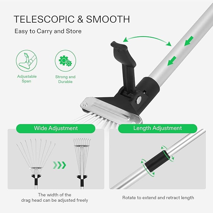 - Telescopic & Adjustable: The 15-tine rake head can expand from 7.25 to 25.6 inches in width and the 9-tine one can expand from 4.7 to 13.3 inches; The telescopic handle of the metal rake can also be extended to retracted to reduce back bending and fatigue