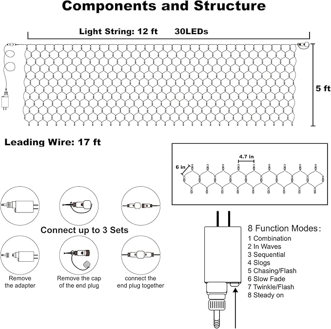 - 8 Lighting Functions: Our Christmas mesh string lights have 8 lighting modes: combination, in waves, sequential, slogs, chasing/flash, slow fade, twinkle/flash, and steady on. Fit different occasions, moods, feelings, holidays, festivals, anniversaries, etc. Pressing the round button on the transformer to change the lighting modes.