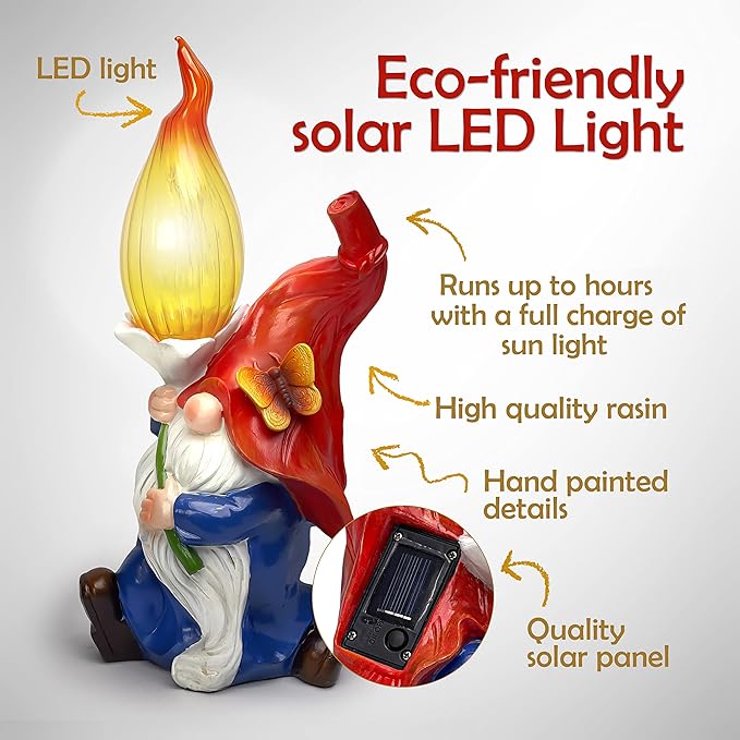 - [Solar Powered] : These garden decor gnomes can brighten up your space at night. These solar garden decorations absorb the sunlight during the day with its high quality built-in solar panel and automatically illuminate your outdoor space with a warm glow when the sun sets or the surrounding becomes dark. It can run up to 8 to 12 hours and has an ON and OFF button. These light up gnomes can be switched on using buttons in the daytime