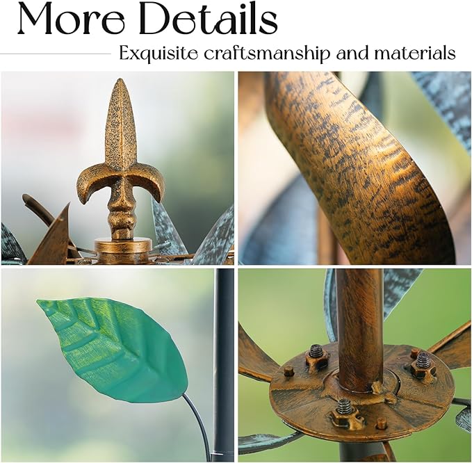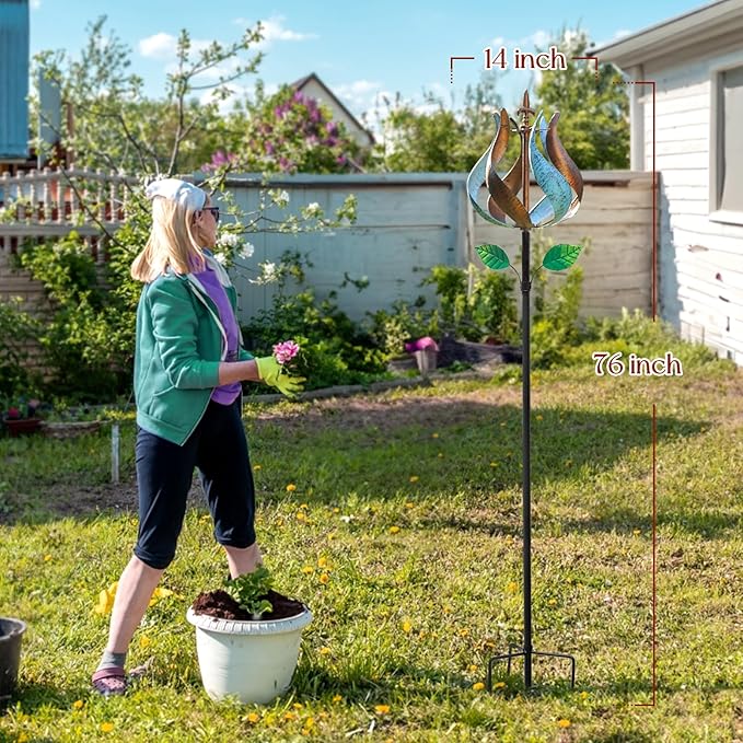 - Height Adjustment: The height can be adjusted to 55 inches or 75.5 inches, unlike the small size garden spinners, the large wind spinner with a blade diameter of 14 inches is more ornamental, rustproof coating to maintain the exquisite colors