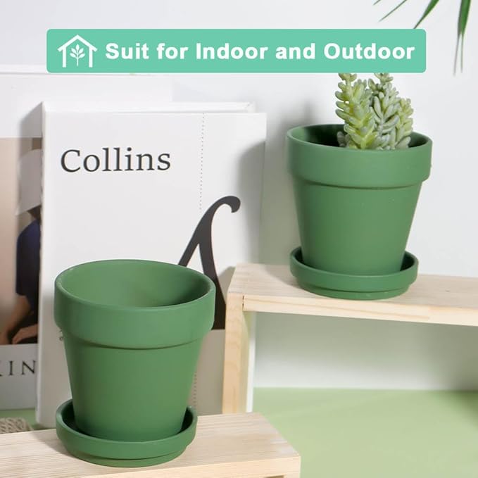 vensovo 4 Inch Small Green Terracotta Plant Pots with Saucer - 6 Pack Clay Flowerpots with Drainage, Great for Indoor Outdoor Plants, Crafts, Wedding Favor