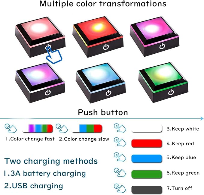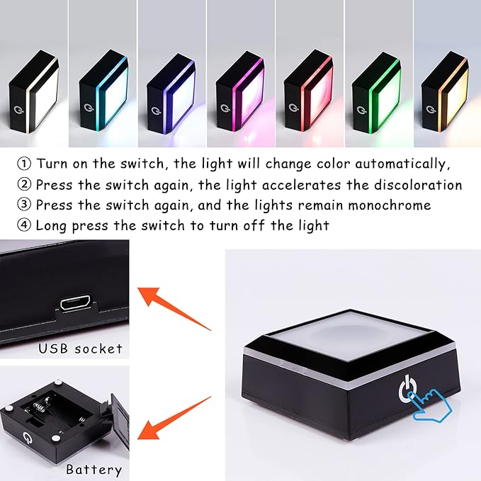 - Led Colorful Light Base: Six Lighting Modes: (Slow Flashing Multi-Coloured; Fast Flashing Multi-Coloured; Constant White Light,Red Light,Blue Light and Green Light). Light the crystal in various colors.
