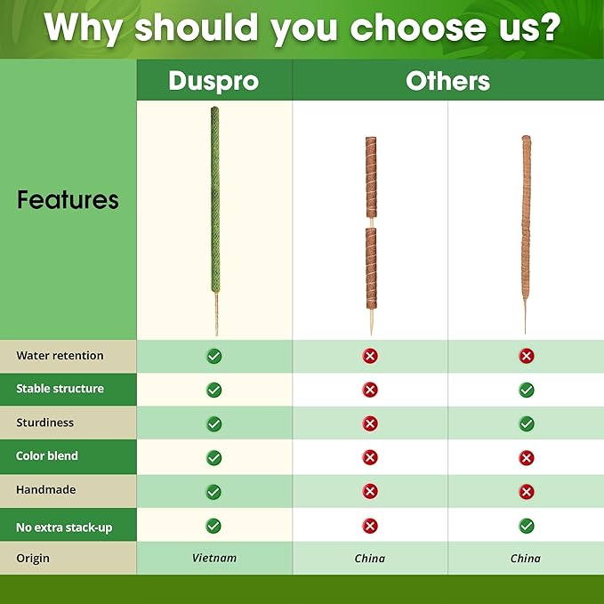 - πͺ΄πππππππππππ ππππππππ π πππππππ: Our moss poles are proudly crafted by skilled workers in Vietnam, ensuring an exceptional finish and meticulous attention to detail. This superior craftsmanship delivers a high-quality product that enhances the visual appeal of your plant display.