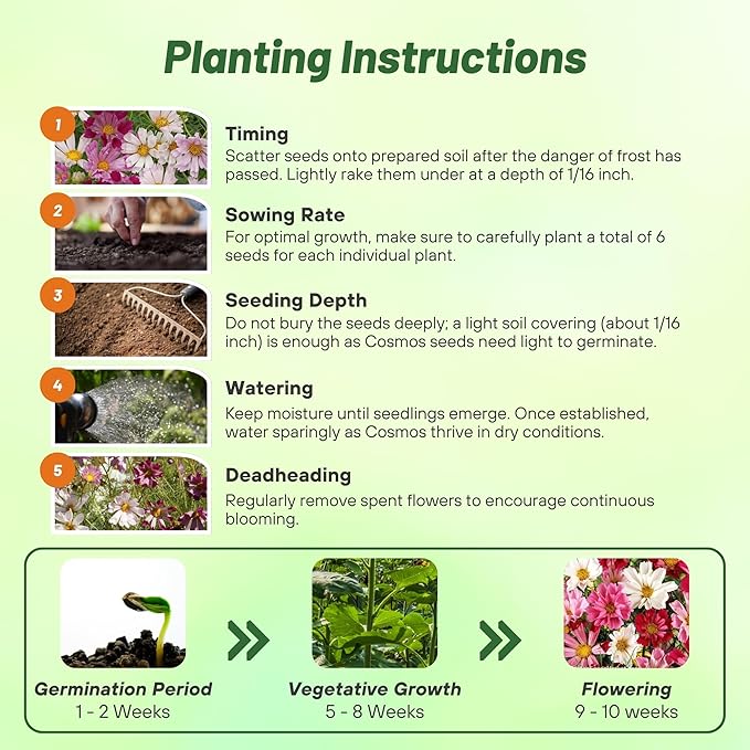 - For best planting results, sow 6 cosmos seeds per plant and space 24 inches apart