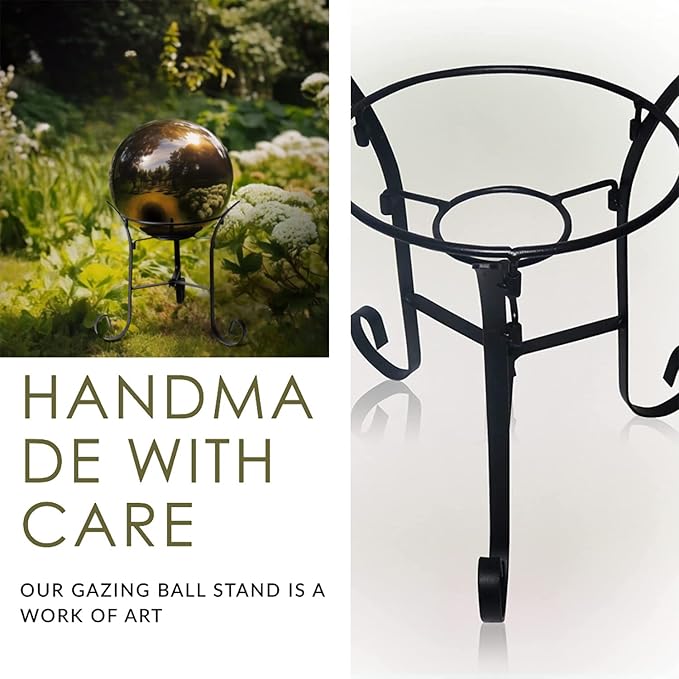 - UNIQUE DESIGN - The gazing ball tripod stand is hand-made by professionals to make a enchanting and unique design. Three forged tabs cradle the gazing ball for delicate support, it has a stem is captured in the tubular section at the top of the stand, ensuring the globe will stay seated in place, Just simple installation can be placed in the garden