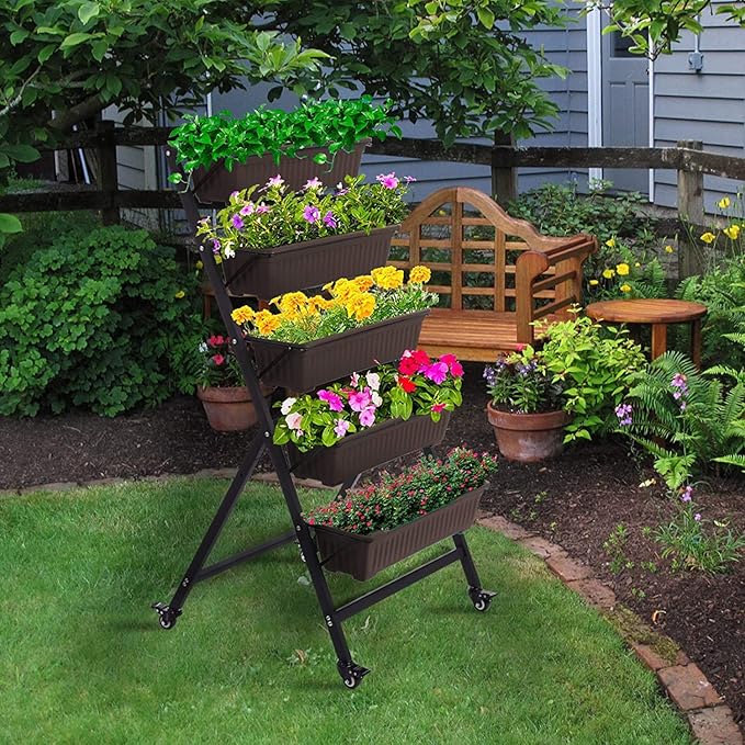 - 【Basic Structure】 The 5 tiers vertical garden bed’s each bottom has two drainage holes, which can prevent plants from rot or over-drying. 4 lockable wheels can help you move it indoor or outdoor as you want