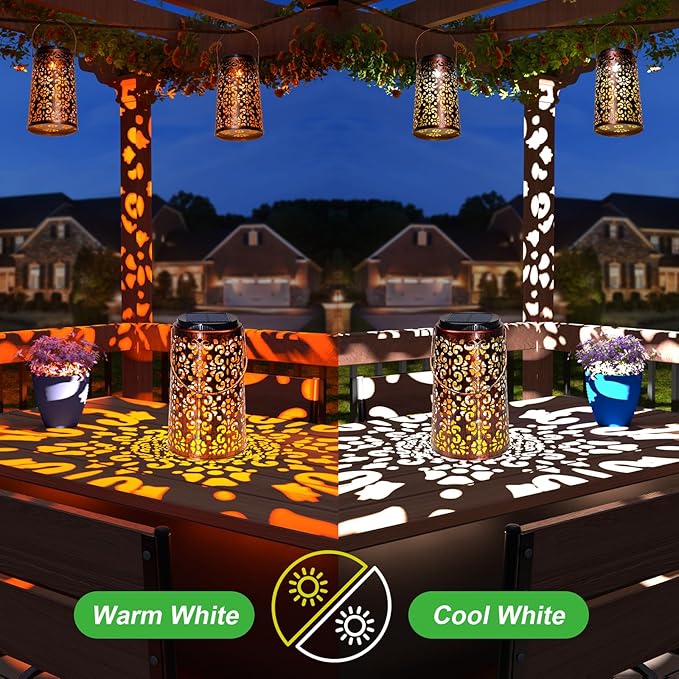 - cute decorative solar lantern with unique hollowed-out & gorgeous pattern design. You can hang it on the porch, tree, pergola with the hangring, or placed on the tabletop, lawn, ledge. Present a vivid pretty pattern on the table or the ground, make your patio special. Perfect for garden, yard, backyard, pathway, walkway, courtyard, terrace, balcony, home decoration and as a unique gift for any occasion like Easter, Christmas, Wedding, Party, Halloween, Birthday, etc.