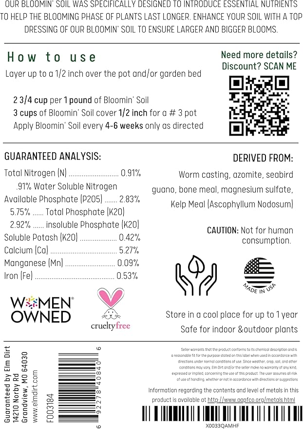 - Benefits of the Product: Enhance the health and vibrancy of your plants with Elm Dirt Bloomin' Soil. This nutrient-rich formula encourages strong root systems, which in turn fosters lush greenery and bountiful blooms. The organic components contribute to improved soil structure and moisture retention, fostering a thriving environment for your plants to flourish.