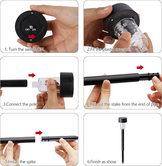 - EASY TO ASSEMBLE: Complete with detailed instructions. These solar garden lights can be done in a few minutes. Just connect the parts (pull out the stakes from the end of pipe) and stake into the soft ground where there has direct sunlight. In stormy weather, keep the solar lights indoors to avoid damaging the solar panels.