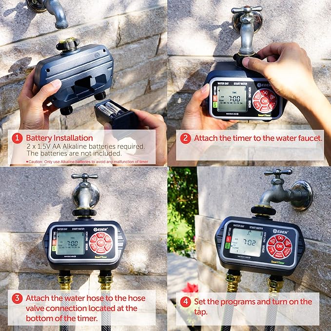 - Manual watering option lets you water on demand to fill a bucket, clean the car, or wash the dog