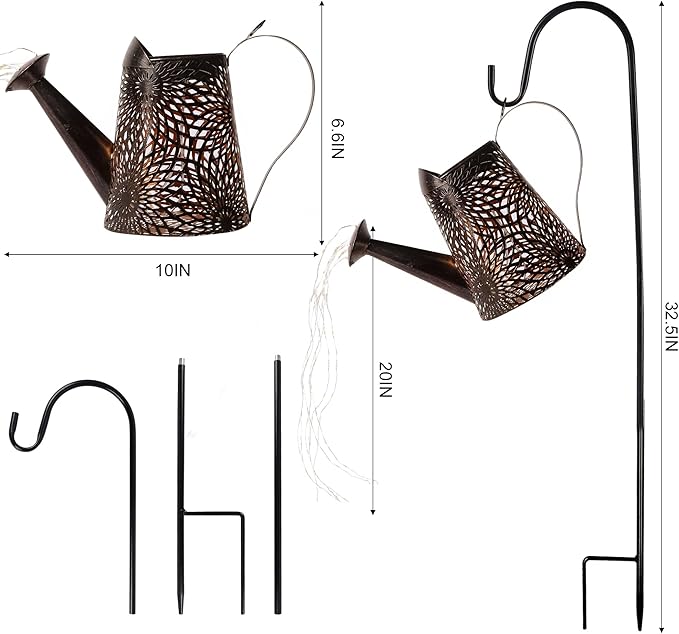- Outdoor Solar Watering Can Garden Lights: Make a dazzling splash in your yard, porch, patio, or garden with our beautiful waterfall watering can lights garden statues with 32.5 inch shepherd hook stake. The solar outdoor watering can with 6 strands copper lights (10 LED each) adds some vitality and fun to any outdoor scene. Watering can Dimensions: 10"L x 5"W x 6.6"H.