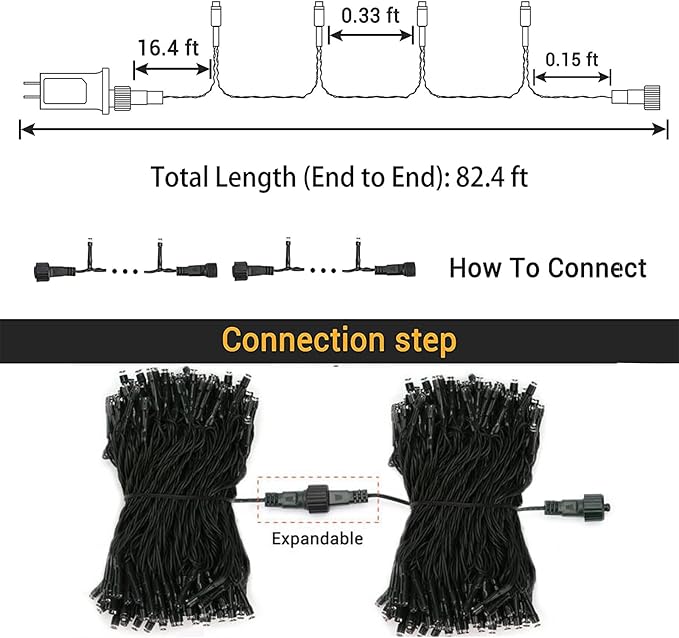 - 【Safe to Use & Easy to Install】UL Listed Plug ensure your safety. Step1-Place or hang the Led Halloween fairy lights on trees, bushes, grass or any other occasions in seconds to finish your decoration. Step2-Plug the transformer into the main supply and power the orange purple string lights on, then you can choose the mode by the button on the power adapter. End to end connectable, up to 5 sets (Total Length: 328ft), long enough to meet your creative lighting decor needs