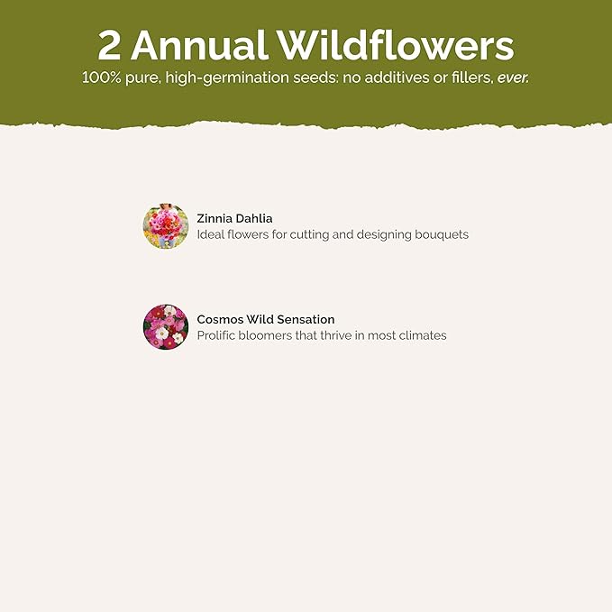 - 100% Pure, Non-GMO Seeds - No fillers, favorites only! Includes 2 easy-to-grow species: Zinnia Dahlia Flowered, Cosmos Sensation
