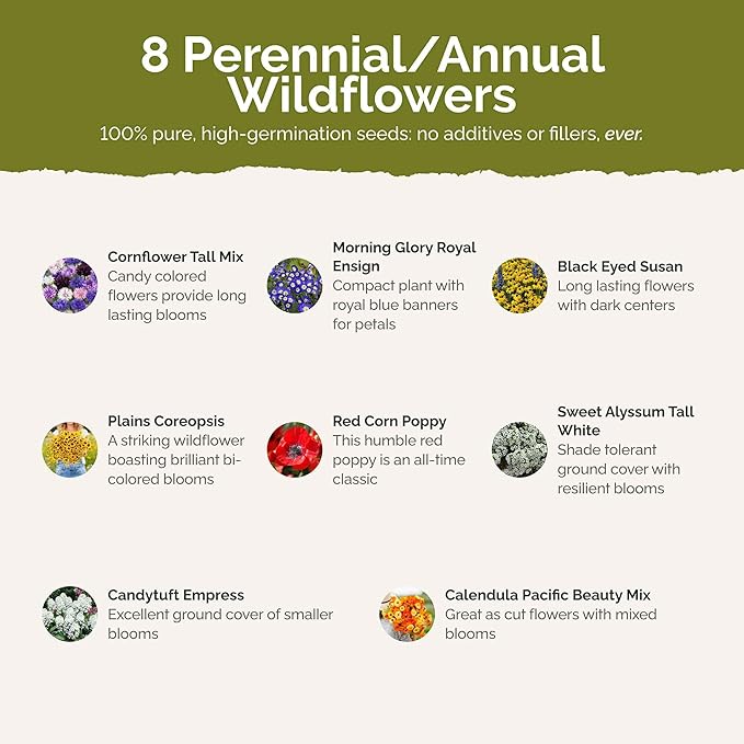 - 100% Pure, Non-GMO Seeds - No fillers, favorites only! Includes 8 easy-to-grow species: Cornflower Mix, Morning Glory Mix, Black Eyed Susan Mix, Coreopsis Mix, Sweet Alyssum, Candytuft