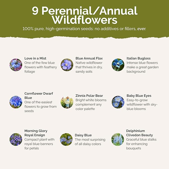 - 100% Pure, Non-GMO Seeds - No fillers, favorites only! Includes 9 easy-to-grow species: Love in a Mist, Annual Blue Phlox, California Bluebell, Cornflower Blue, Zinnia Polar Bear, Baby Blue Eyes, Chicory, Delphinium Blue Bell, Morning Glory Blue Ensign
