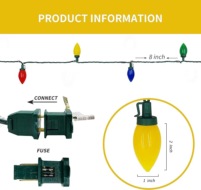 - [Intimate design] Suitable for occasions of various sizes, the total length of a string of lights is 34.5 feet, light length 32.5 feet, the length of the front plug is 20 inches, and the tail plug length is 8 inches. the distance between the bulbs is 8 inches, the height of the bulb is 2 inches, the width is 1 inches.