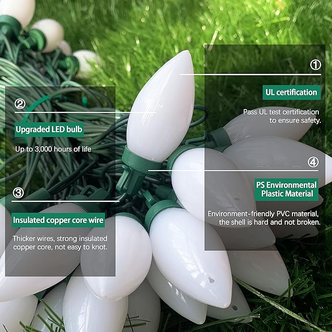 C9 Christmas Lights Outdoor 50 LED Cold White Strawberry Waterproof String Lights Xmas Tree Indoor Decoration Plug in 34.5 Feet Used for Home Festive Courtyard Patio Garden(Cold White)