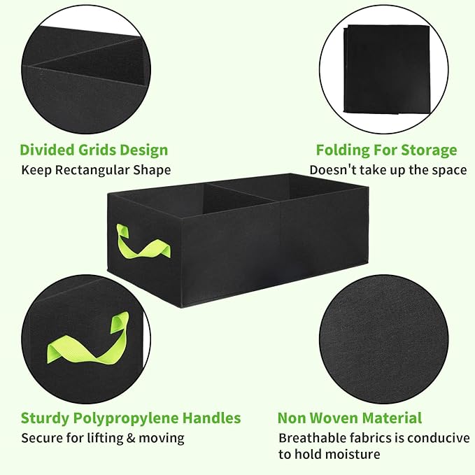 - SIZE & GRID DESIGNED : Pack with 2PCS 36 Liters/10 Gallons planter bags, which sizes: 23.62in x 11.81 in x 7.87in (L x W x H). this garden bed is adopted 2-grid design,this design avoid the issue of ordinary square grow bags, it not only can keep the sides of bag holding up but not be saggy,but also you can use each gird according to the elements required by different plants, more practical and convenient, help you achieve a more satisfactory harvest.
