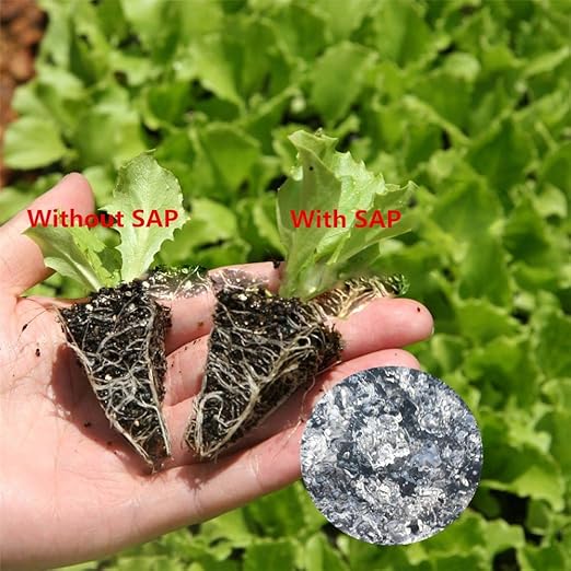 - Potassium-based Super Absorbent Polymer (SAP) that does not cause soil clumping. It is the best for growing conditions in plants that require moist, fluffy, nutrient-rich soil.