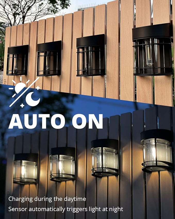 - Auto ON/Off & Cost-effective - Automatically turn on at dusk and off at dawn, fence solar lights run on energy gathered from sunlight, provide all night lillumination for fence deck yard after full charging. No need to manually turn it on/off everyday.