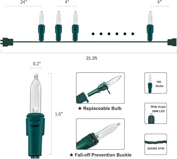 - 【Mini LED Christmas Lights Specification】: This green wire christmas string lights includes 100 count cool white led lights, total length 35.3ft, lights length 33ft and each led is 4 inches apart, 24 inches lead wire, 4 inches end connector (Extra 2 x replacement bulbs and 2 x fuse included)