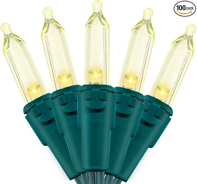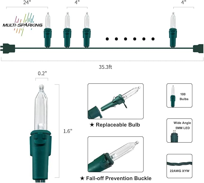 - 【Mini LED Christmas Lights Specification】: This green wire christmas string lights includes 100 count warm white led lights, total length 35.3ft, lights length 33ft and each led is 4 inches apart, 24 inches lead wire, 4 inches end connector (Extra 2 x replacement bulbs and 2 x fuse included)