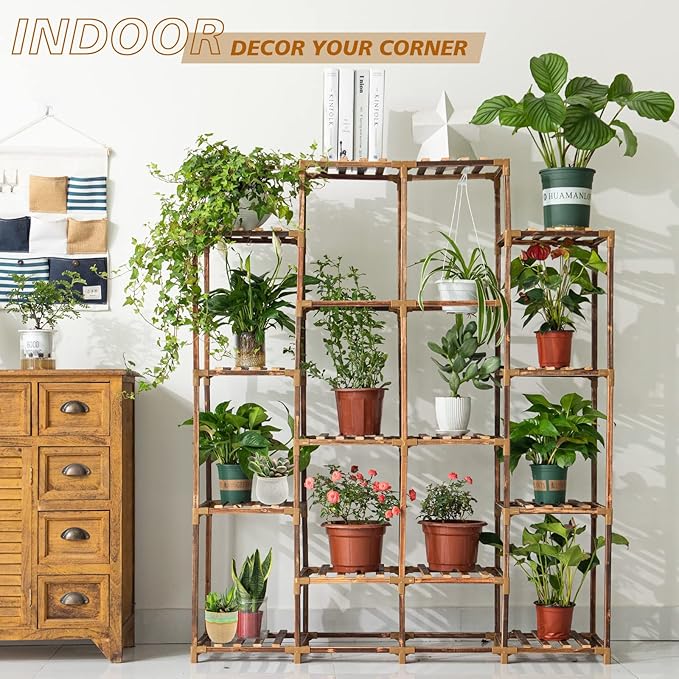 - 【100% Solid Wood, Sturdy & Durable】The plant racks are made of high-quality wood and carbonized at high temperatures. More durable and easy to clean. No paint surface, healthy and eco-friendly, so the indoor plant stand is very safe for families with children and pregnant women. And the corner plant stand can be used indoors and outdoors.